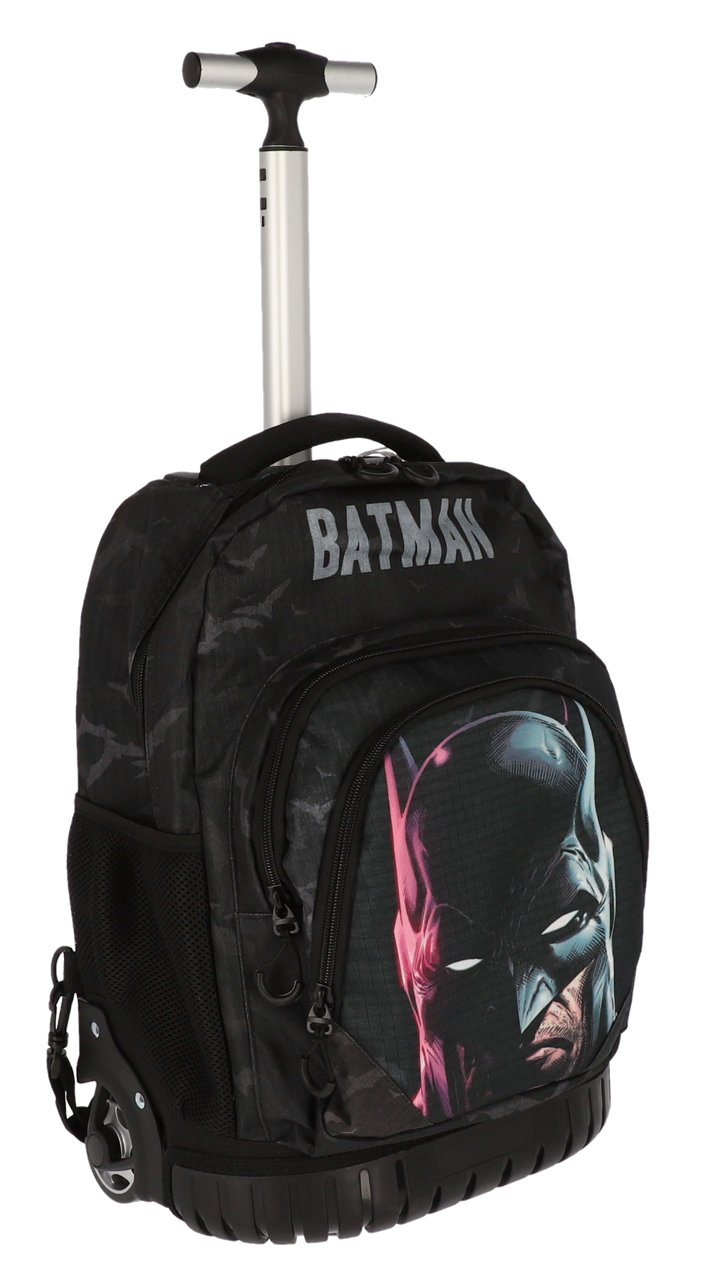 Ghiozdan troler DC Comics Batman cu design negru camuflaj, dimensiuni 47×32×25 cm, echipat cu roți rezistente și mâner telescopic retractabil. Perfect pentru fanii supererouilor, oferă spațiu generos de depozitare, compartimente multiple și bretele ajustabile pentru purtare confortabilă.