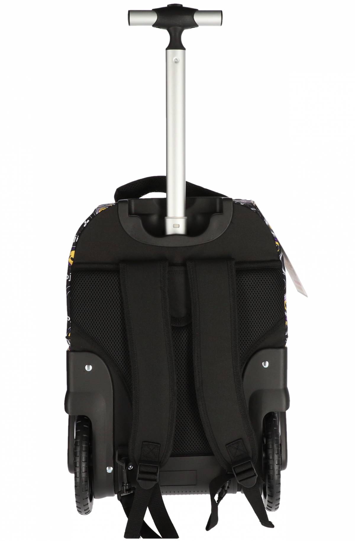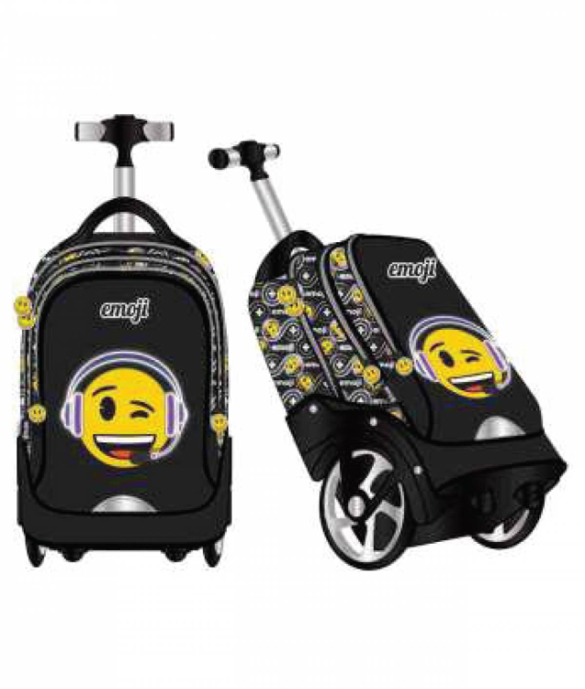Ghiozdan troller Emoji negru cu 3 compartimente și căști incluse, dimensiuni 50×34×26 cm, greutate 2,80 kg. Design modern cu imprimeu emoji, roți rezistente și mâner telescopic retractabil, ideal pentru școală și călătorii. Spațios și ergonomic, oferă organizare optimă.