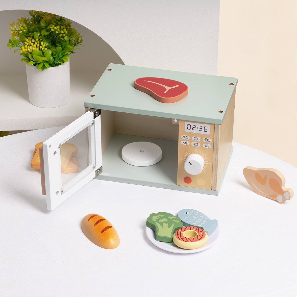 Microwave Oven Set este un set de joaca din lemn, ideal pentru copiii pasionati de jocurile de rol in bucatarie. Cuptorul de microunde are un design realist, cu usa functionala, buton rotativ si afisaj tip timer, oferind o experienta de joaca autentica si captivanta.