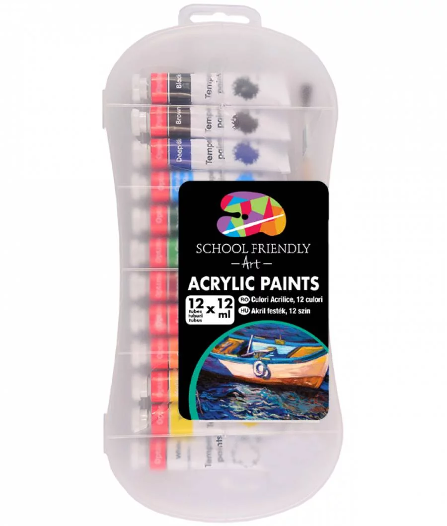 Set de culori acrilice School Friendly Art cu 12 tuburi metalice de câte 12 ml fiecare, ambalate într-o cutie practică din plastic transparent. Perfecte pentru pictura artistică, aceste vopsele acrilice oferă culori vibrante și acoperire excelentă, ideale pentru artă, hobby și proiecte creative.