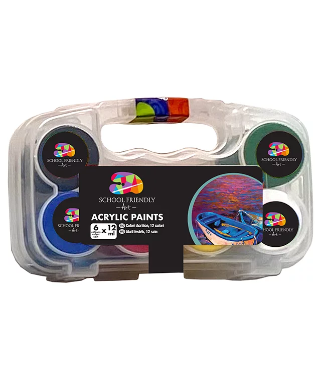 Set de vopsele acrilice School Friendly Art cu 6 culori vibrante în tuburi de 20ml, ambalate într-un container plastic transparent rezistent. Perfecte pentru artă și creativitate, aceste culori acrilice oferă acoperire excelentă și uscare rapidă, ideale pentru proiecte școlare și hobby.