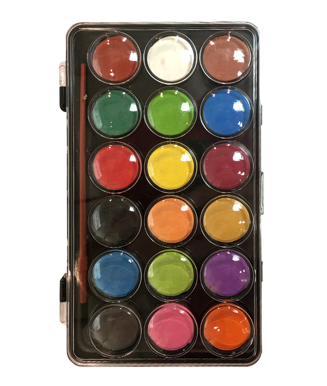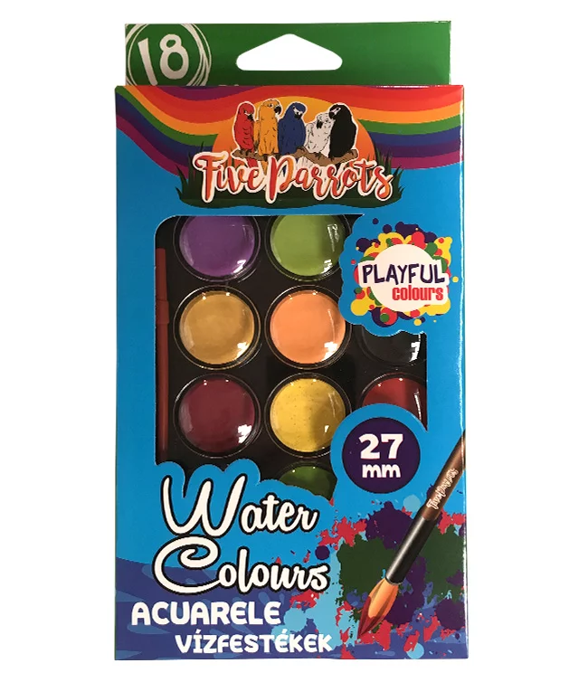 Set acuarele Five Parrots cu 18 culori vibrante de 28mm, ideal pentru pictura artistică și hobby-uri creative. Include pensulă în cutie, oferind pigmenți intensi și ușor de amestecat pentru copii și adulți. Perfecte pentru proiecte școlare și artistice.