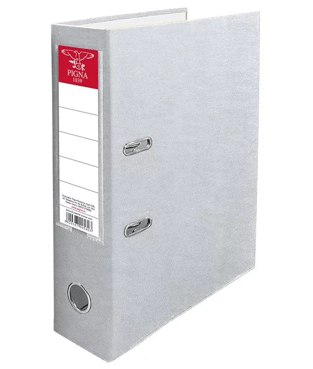 Biblioraft plastifiat PIGNA cu șină de 5 cm, în culoare gri elegantă, ideal pentru organizarea documentelor de birou. Mecanism de prindere metalic rezistent, cu copertă plastifiată durabilă și etichetă personalizabilă pe șira dorsală pentru identificare rapidă.