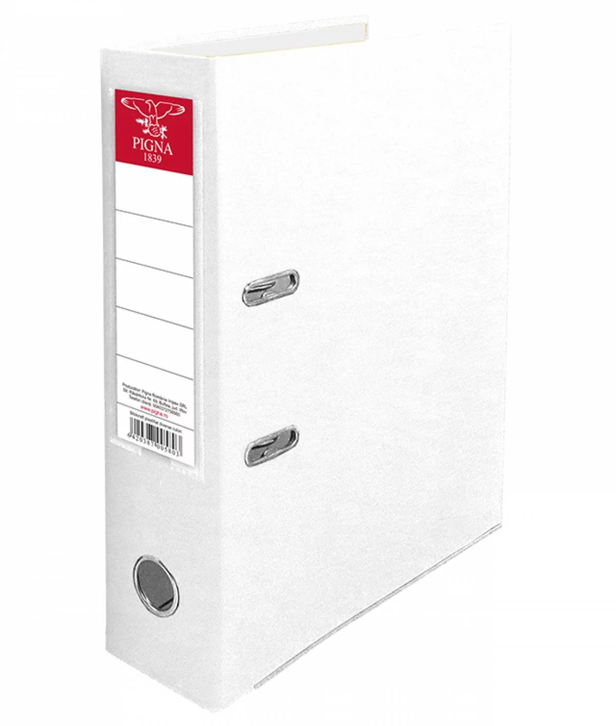 Biblioraft PIGNA plastifiat alb cu șină de 7,5 cm, ideal pentru arhivarea documentelor la birou sau acasă. Mecanism cu pârghie metalică rezistentă, carton plastifiat durabil și etichetă pentru indexare. Design clasic și funcțional pentru organizarea eficientă a dosarelor.