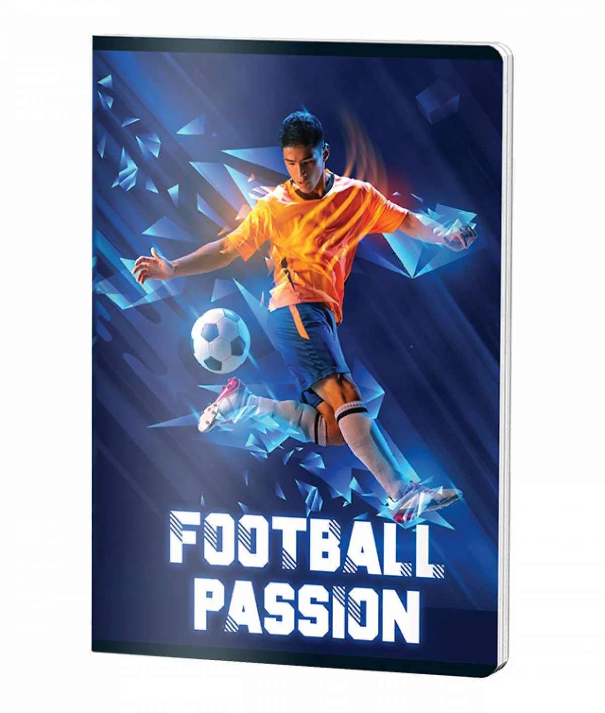 Caietul capsat Pigna Clasic A4 cu 60 de file dictando și hârtie de 70 gr este ideal pentru băieți pasionați de fotbal. Design-ul modern prezintă un jucător dinamic în tricou portocaliu pe fundal albastru cu efecte geometrice și textul "Football Passion", perfect pentru notițele școlare.