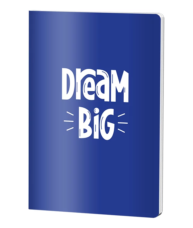 Caiet dictando Pigna format A4 cu copertă din plastic albastru și mesajul inspirațional "Dream Big", ideal pentru notițe și schiță. Include 60 de file de 70 grame, capsate pentru durabilitate. Design modern și motivant, perfect pentru elevi și studenți care își doresc papetărie de calitate.