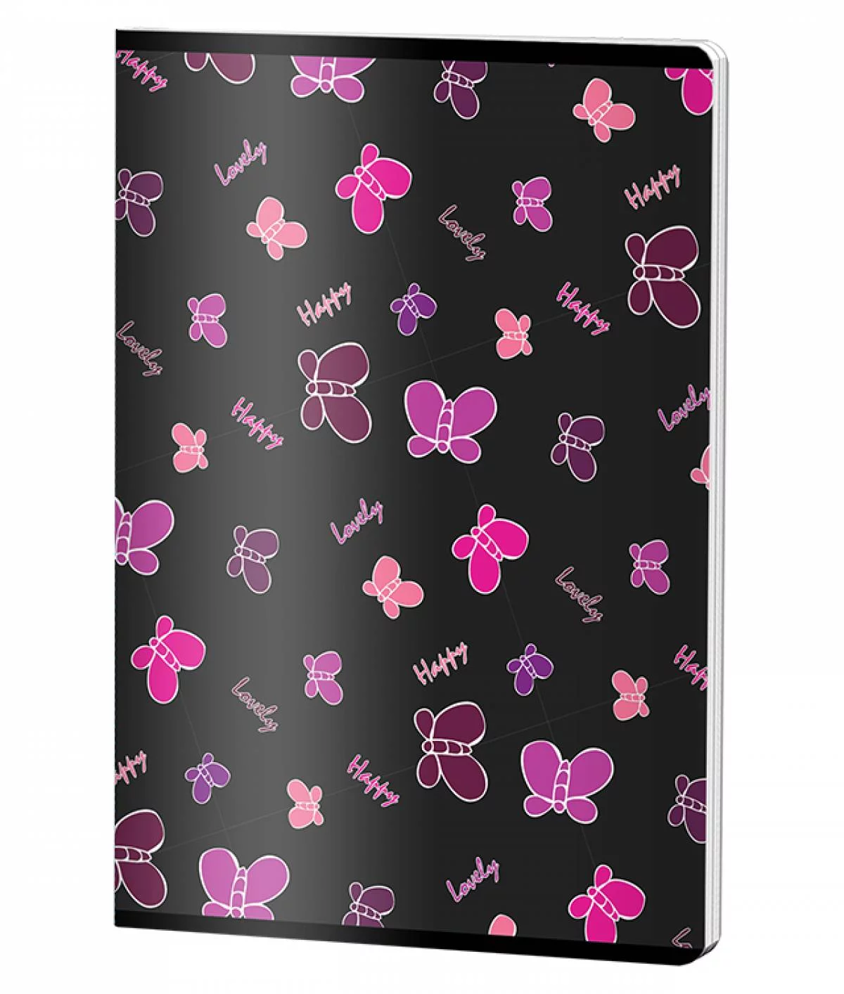 Caiet Pigna dictando A4 cu copertă din plastic rezistentă, decorată cu fluturi roz și mov pe fond negru. Conține 60 de file de 70 grame, capsate, ideal pentru notițe și lecții. Design atractiv pentru fete, combină funcționalitatea cu un stil vesel și colorat.