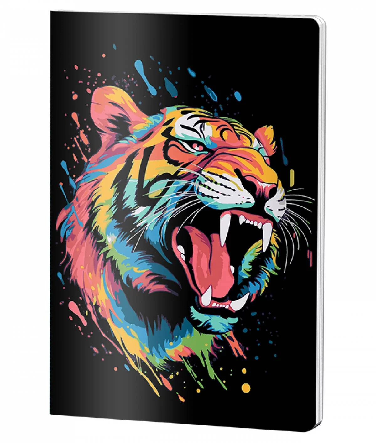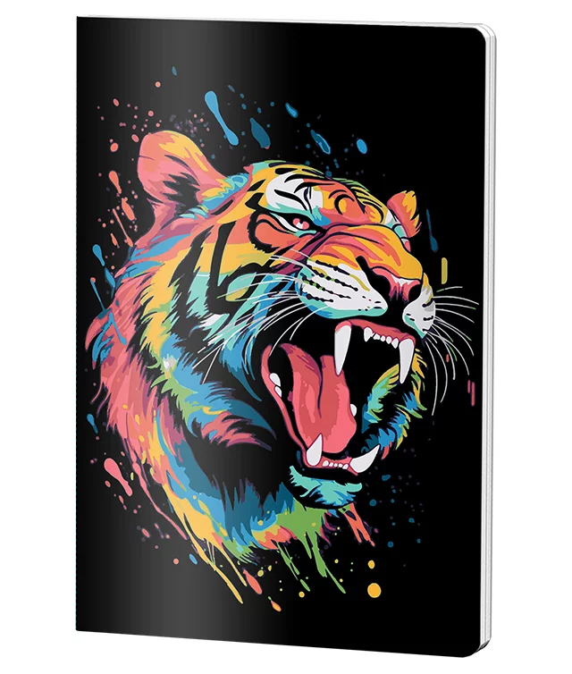 Caietul Pigna Dictando A4 cu 60 de file captivează prin coperta din plastic cu design vibrant de tigru colorat pe fond negru. Ideal pentru notițe și schițe, acest caiet capsat oferă hârtie de 70 grame cu liniere dictando, combinând funcționalitatea cu un stil artistic modern.