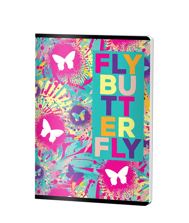 Caiet dictando Pigna format A5 cu copertă din plastic rezistent, 48 file de 70 grame, design vibrant cu fluturi albi și mesajul colorat Fly Butterfly Fly. Ideal pentru școală și birou, acest caiet capsat combină funcționalitatea cu un stil vesel și inspirațional, perfect pentru fete.