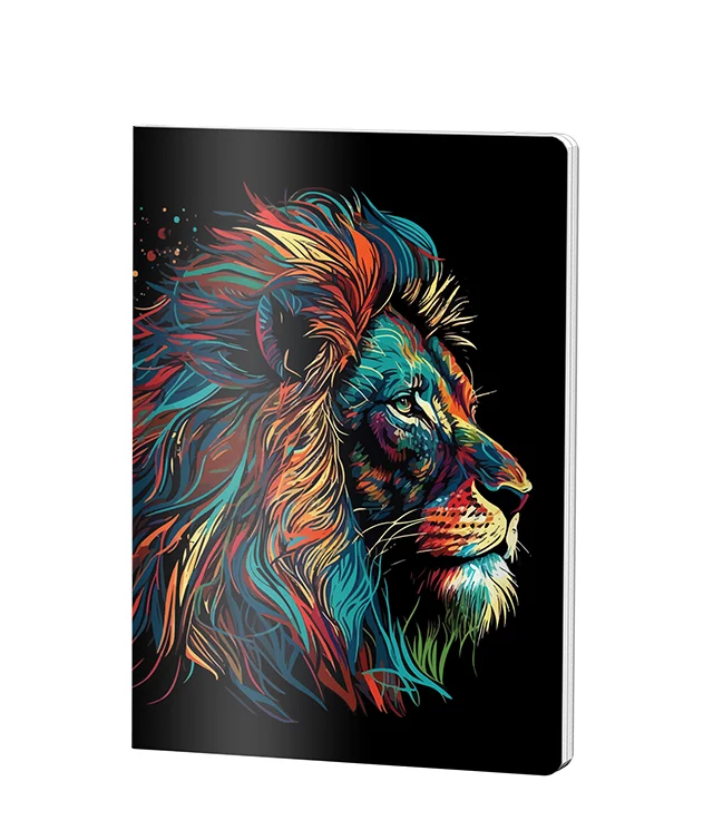 Caiet dictando Pigna format A5 cu 48 de file și copertă din plastic rezistent, decorat cu un design artistic spectaculos cu leu colorat multicolor pe fond negru. Hârtia de 70 grame asigură o scriere confortabilă, iar capsarea solidă garantează durabilitate pentru școală sau birou.