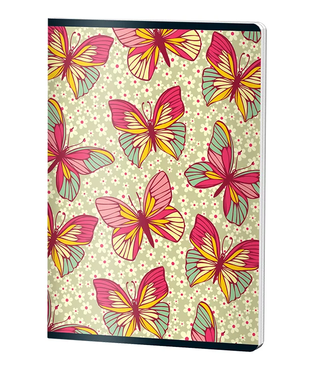 Caiet capsat Pigna Clasic pentru matematică, format A4, 60 file de 70 grame, cu copertă colorată decorată cu fluturi în tonuri de roz, galben și mentă pe fond bej cu buline. Ideal pentru școală, acest caiet oferă hârtie de calitate pentru dictando și exerciții matematice, cu design vesel perfect pentru fete.