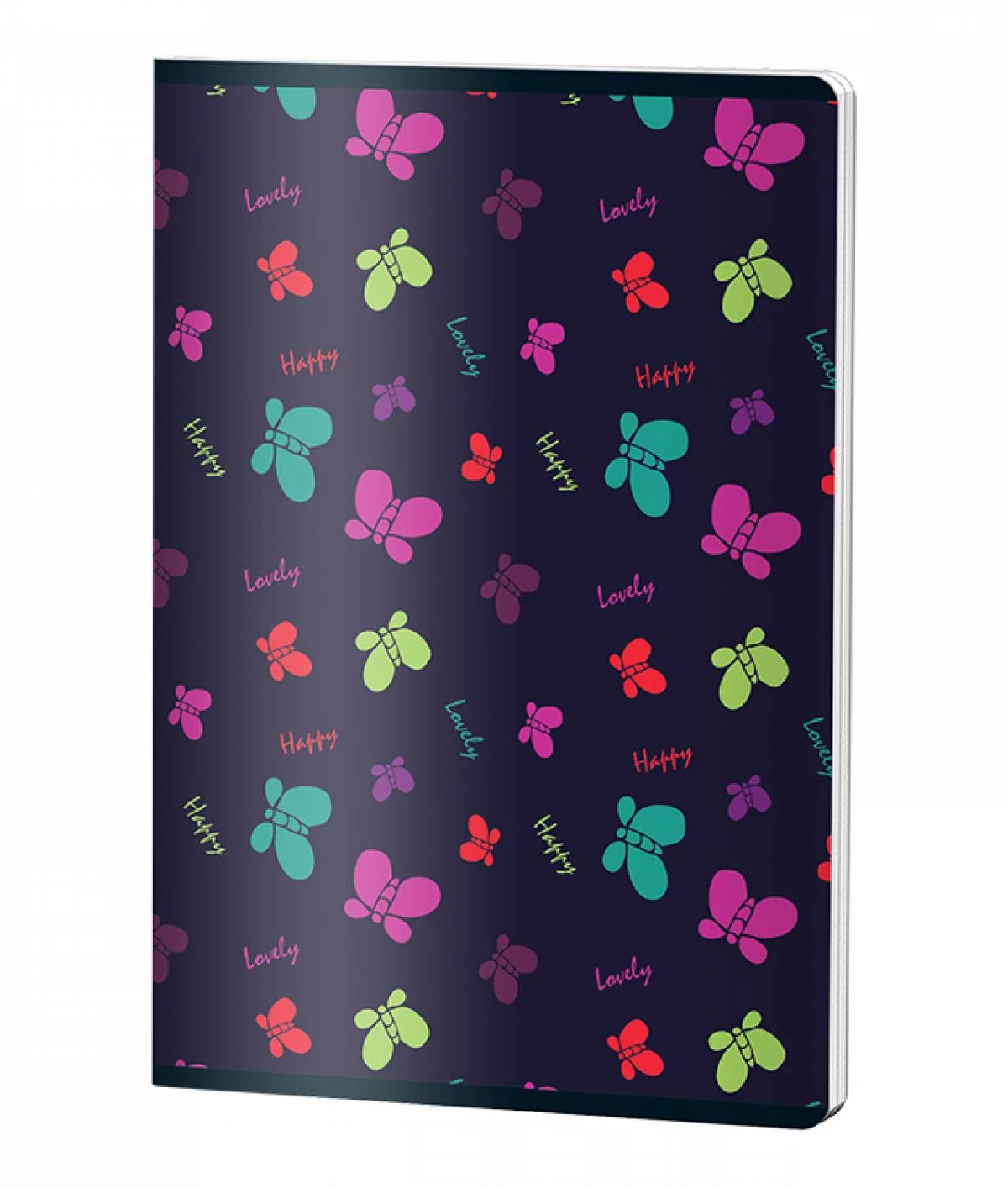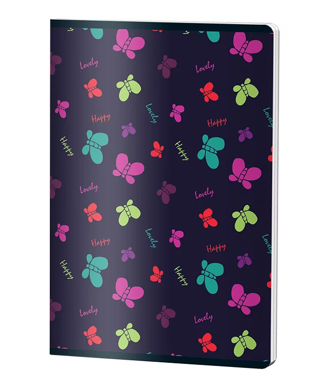 Caiet capsat Pigna Clasic pentru matematică, format A4, cu 60 de file de 70 grame, ideal pentru școală. Coperta prezintă un design vesel cu fluturi colorați pe fond întunecat și inscripțiile Happy și Lovely, perfectă pentru fete care doresc rechizite vesele și practice.