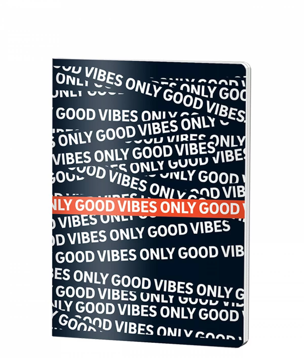 Caiet dictando A4 Good Vibes cu copertă neagră modernă și inscripții albe repetitive, conține 60 de file de 70 grame, ideal pentru notițe și teme. Design tineresc cu bandă corai decorativă, perfect pentru școală sau birou, oferind calitate și stil.