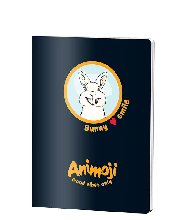 Caiet dictando A5 Animoji Bunny cu 80 de file, hârtie de 70 gr, coperta neagră cu design vesel cu iepuraș zâmbitor. Ideal pentru școală și birou, acest caiet oferă spațiu generos pentru notițe și teme, cu grafică colorată și motivantă pentru elevi și studenți.