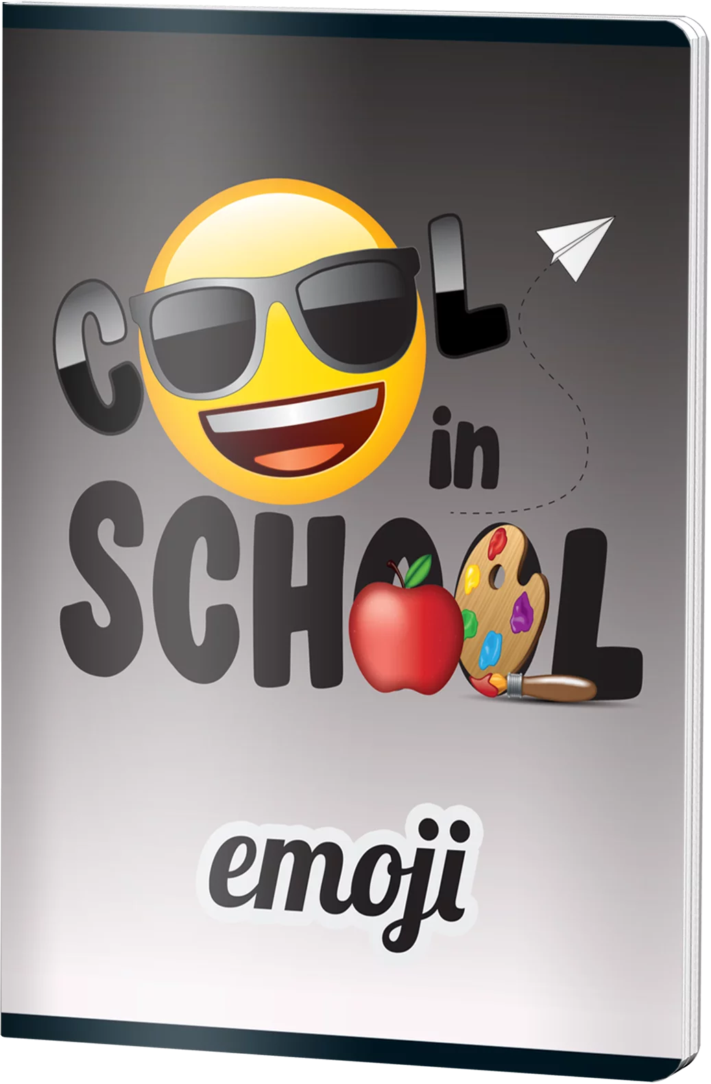 Caiet dictando EMOJI CLASIC format A5 cu 48 de file și hârtie de 70 grame, ideal pentru școală. Copertă cu design modern și colorat, cu emoji vesel cu ochelari de soare și mesajul motivant „Cool in SCHOOL", perfectă pentru elevi și studenți care doresc rechizite școlare vesele și practice.