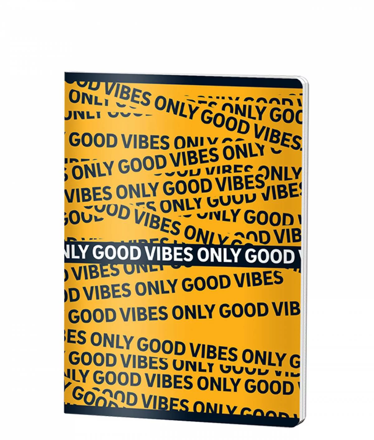 Caiet dictando A5 Good Vibes cu copertă portocalie vibrantă și design modern cu mesaj motivațional repetat. Include 48 de file dictando de 70 grame, ideal pentru notițe, cursuri sau jurnal personal. Coperta durabilă cu accente negre oferă protecție și stil tineresc.