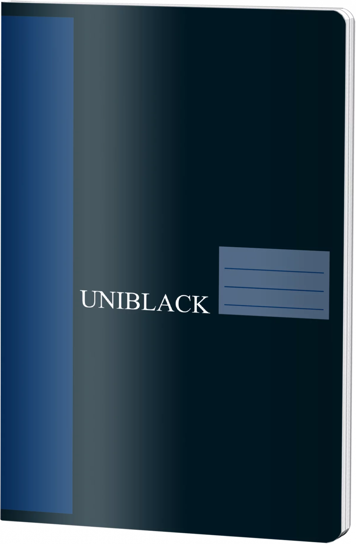 Caiet dictando Uniblack format A5 cu 48 file și hârtie de 70 grame, ideal pentru notițe și schiță. Copertă rezistentă în tonuri de negru și albastru, design modern cu colțuri rotunjite și etichetă pentru personalizare, perfect pentru școală sau birou.