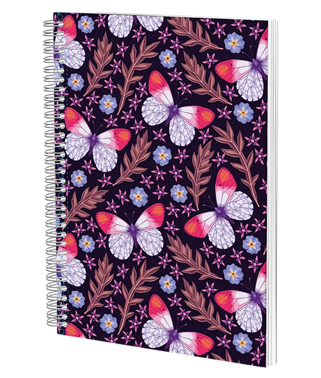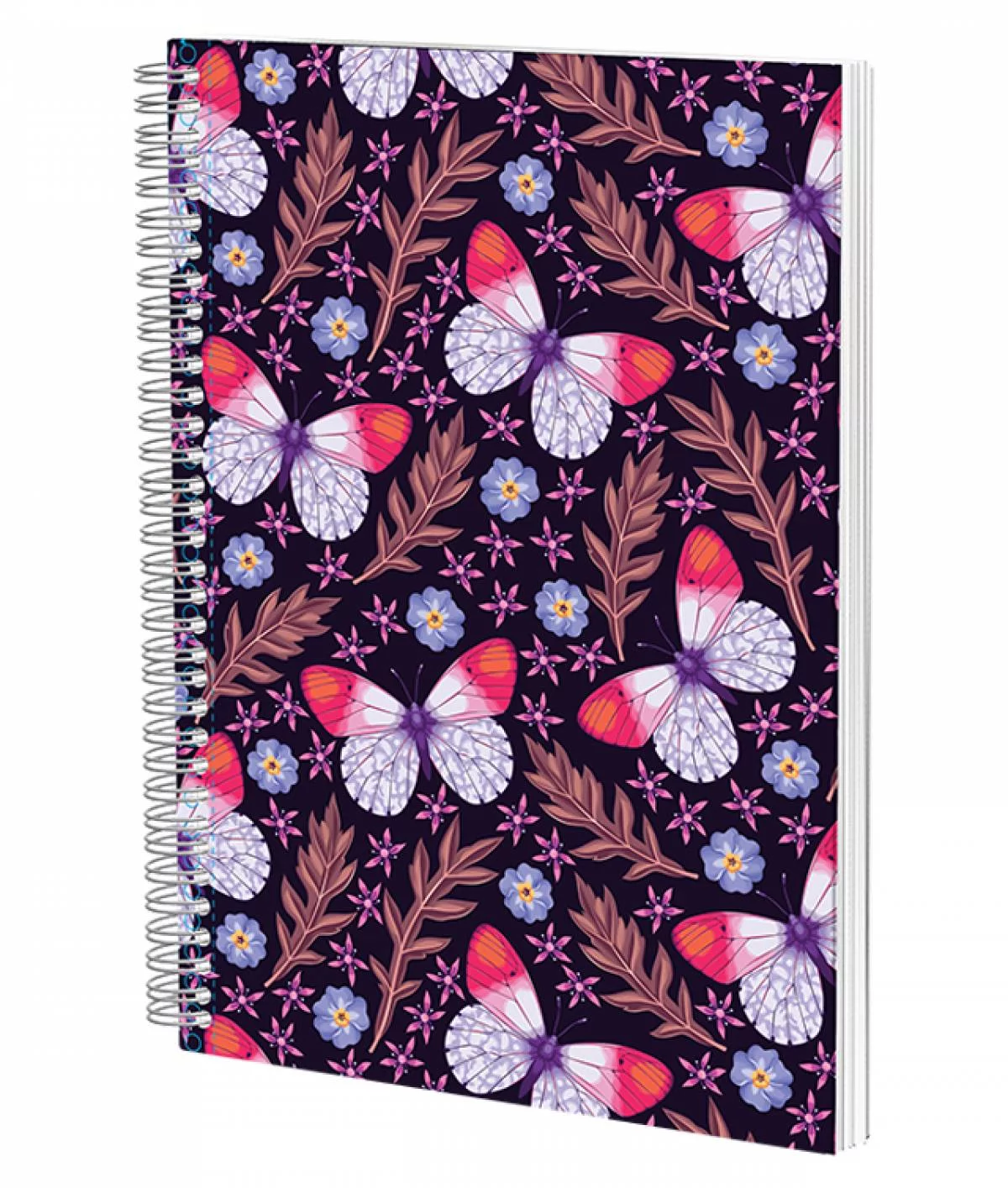 Caietul cu spiră PIGNA format A4 pentru matematică oferă 140 de file de 70 grame cu copertă din plastic rezistentă, decorată cu un design elegant de fluturi roz și mov pe fond întunecat. Ideal pentru elevi și studenți, acest caiet combină funcționalitatea cu un stil atractiv, fiind perfect pentru notițe și exerciții matematice zilnice.