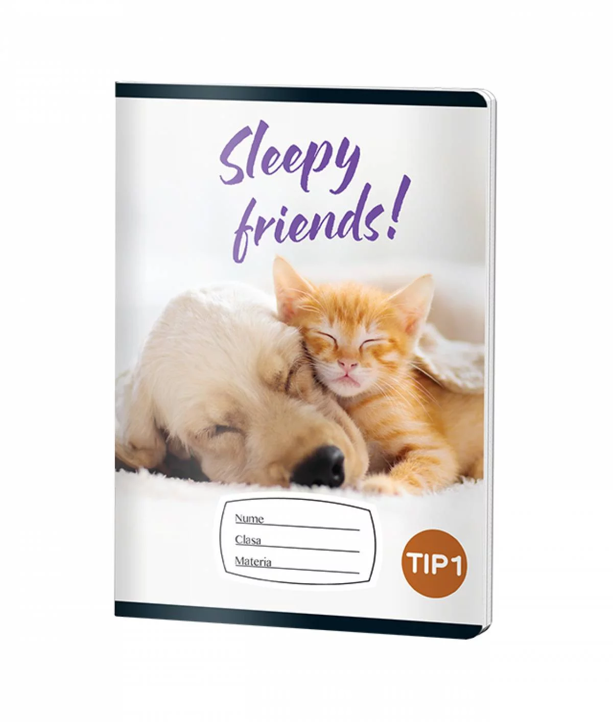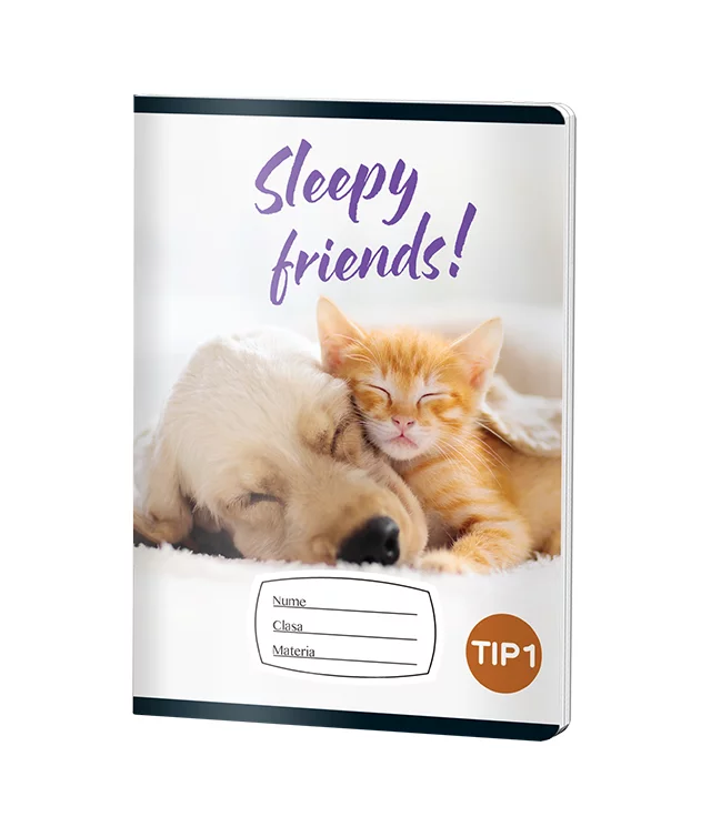 Caiet A5 Pigna Pet Friend pentru băieți, cu 24 de file din hârtie de 70 grame, decorat cu imagini adorabile de animale de companie. Design vesel cu cățel și pisică, ideal pentru școală, cu spațiu pentru nume și materie pe copertă.