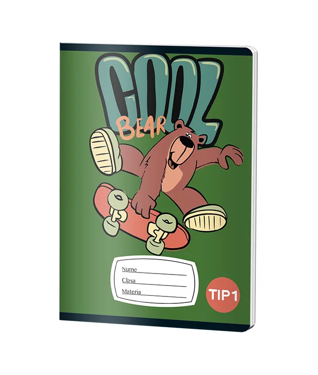 Caiet școlar Pigna A5 pentru băieți, colecția Skatie, cu 24 de file din hârtie de 70 grame, design captivant cu urs pe skateboard pe copertă verde. Ideal pentru lecții, teme și notițe, oferă calitate superioară marca Pigna pentru un an școlar de succes.