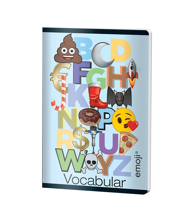 Caiet vocabular Emoji Clasic cu 24 de file și hârtie de 70 grame, ideal pentru învățarea limbilor străine. Design vesel cu emoji-uri și litere colorate pe copertă, perfect pentru elevi și studenți care doresc să-și organizeze vocabularul într-un mod distractiv și eficient.