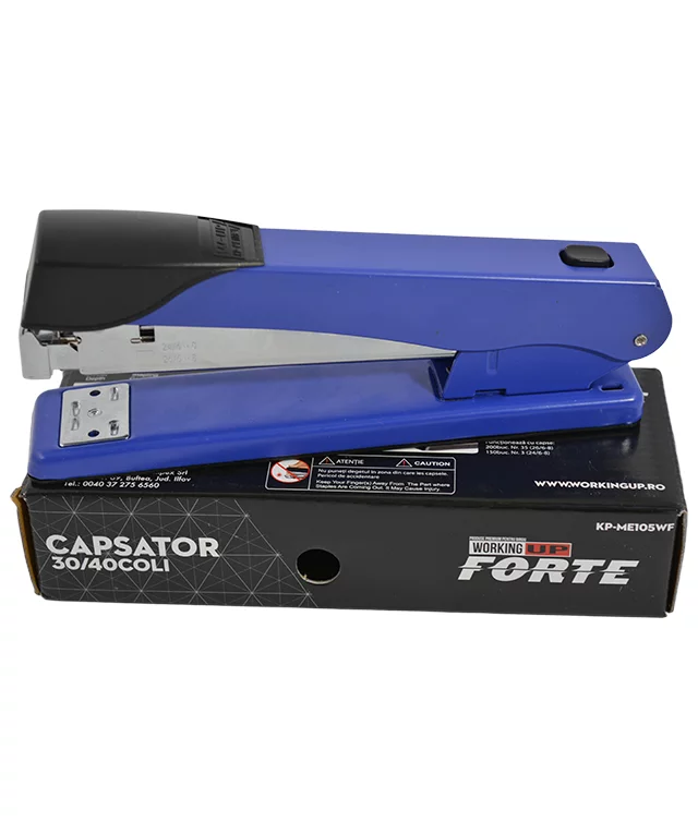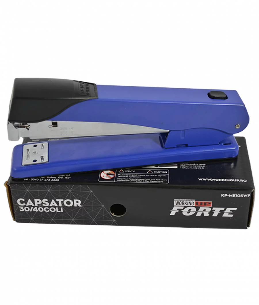 Capsator metalic W-UP FORTE albastru cu capacitate de 30-40 de coli, dimensiune 105mm, ideal pentru birou și școală. Construcție robustă din metal cu design ergonomic și finisaj modern în albastru intens, asigurând capsare eficientă și durabilitate superioară.