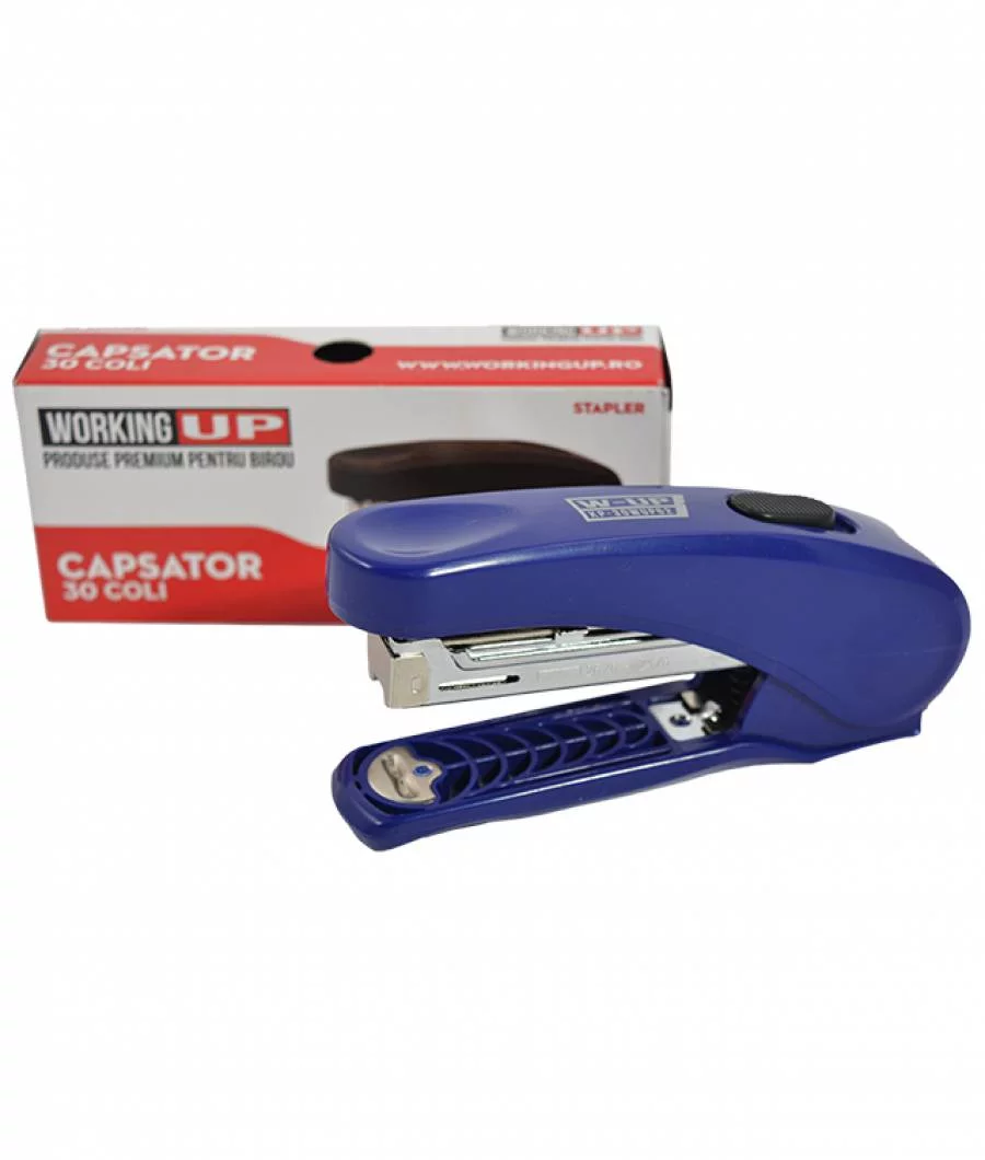 Capsator de birou Working UP din plastic rezistent, culoare albastru, capacitate 30 de file, capse de 62mm. Design ergonomic cu corp din plastic durabil și bază metalică, ideal pentru organizarea documentelor la birou, școală sau acasă. Produs calitativ pentru capsare eficientă.