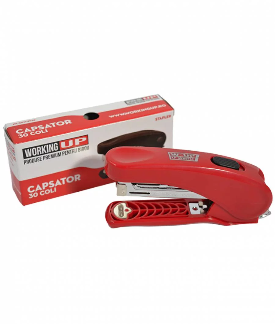 Capsator de birou W-UP roșu din plastic rezistent, capacitate 30 de coli, cu deschidere capsă de 62mm. Design ergonomic cu buton de decapsare și bază metalică durabilă, ideal pentru organizarea documentelor la birou sau acasă. Produs premium pentru capsare eficientă și confortabilă.