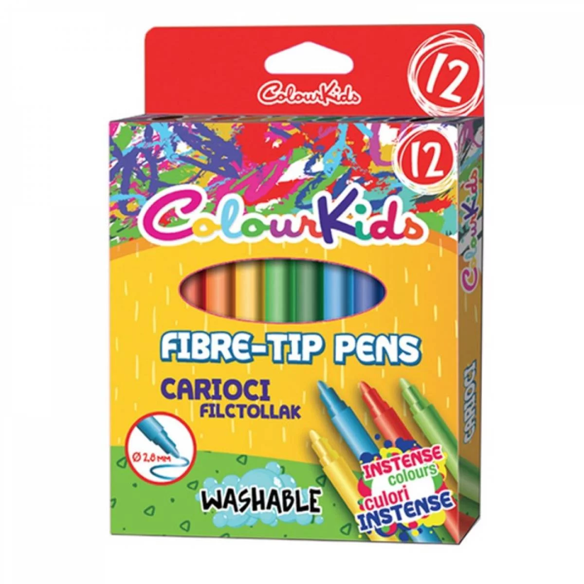Carioci Colour KIDS în 12 culori vibrante, perfecte pentru desen și colorat. Setul include markere lavabile, cu vârf rezistent și capace de siguranță, ideale pentru activități creative ale copiilor. Ambalate într-o cutie practică, ușor de transportat și depozitat.