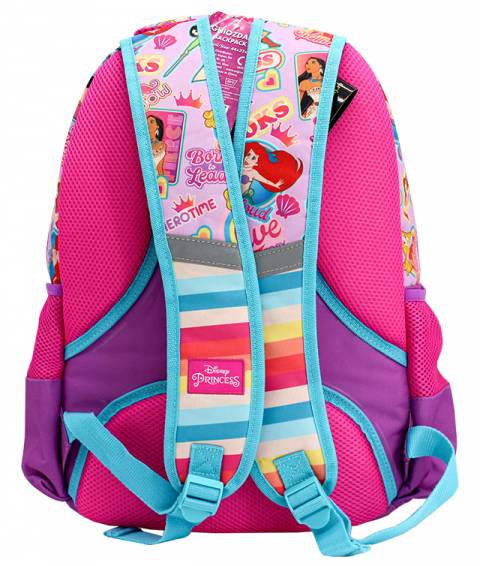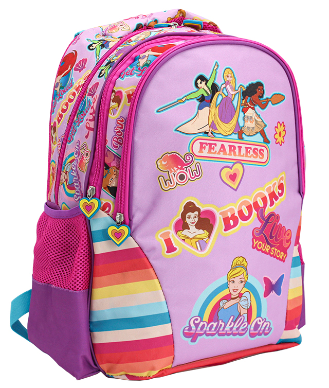 Ghiozdan scolar pentru clasele I-IV, cu imprimeu Princess, fond violet.Ghiozdan confectionat din material impermeabil.Are 1 compartiment incapator, inchis cu fermoar si 1 buzunar frontal inchis tot cu fermoar.Este prevazut cu separator interior si buzunare laterale.Spatele este ergonomic, buretat, permite circularea aerului si protejeaza spatele.Bretelele sunt ferme, ajustabile, cu burete gros, protejeaza umerii.Dimensiuni: 44 cm x 32 cm x 14 cm.