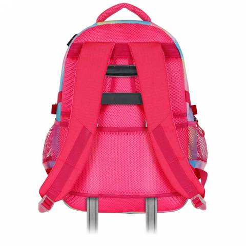 Ghiozdan școlar Barbie cu design tie-dye multicolor în nuanțe de roz, albastru și violet, dimensiuni 46x34x21 cm. Include trei compartimente cu fermoar, bretele ajustabile roz și buzunare laterale, ideal pentru școală și activități zilnice.