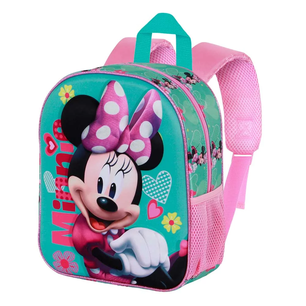 Ghiozdan Disney Minnie Mouse Pose Elite 3D cu design colorat turcoaz și roz, perfect pentru fetițe. Bretele ajustabile matlasate, buzunar lateral din plasă și imprimeu 3D cu personajul Minnie Mouse. Dimensiuni compacte 25×30×10 cm, ideal pentru grădiniță sau plimbări.