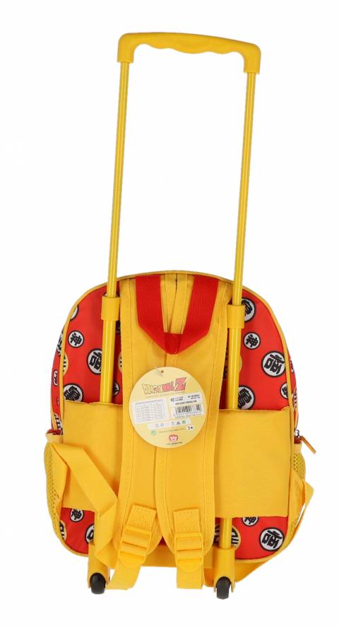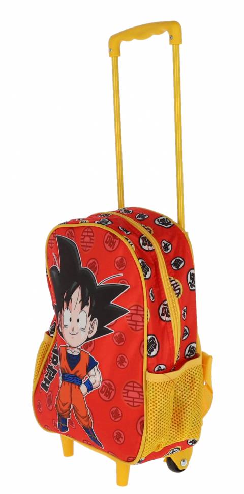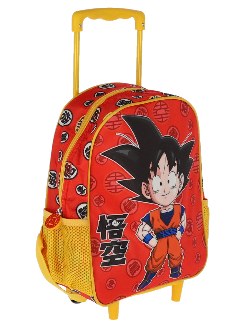 Ghiozdan mic cu roți DRAGON BALL cu personajul Goku, perfect pentru copii. Design vibrant roșu-portocaliu cu detalii galbene, mâner telescopic retractabil și buzunare laterale din plasă. Ideal pentru grădiniță și școală, oferind confort și stil inspirat din celebrul anime.
