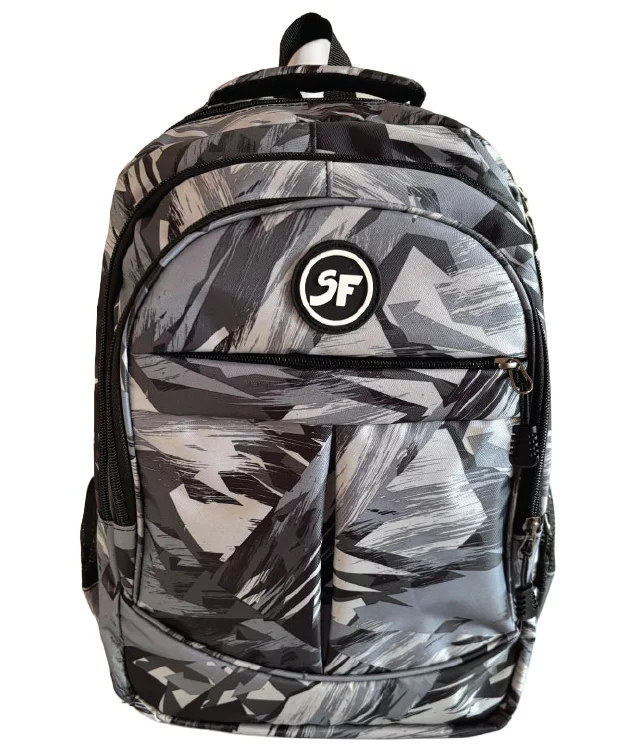 Ghiozdan laptop SF 4F cu design camuflaj negru, dimensiuni 42×37×13 cm și greutate redusă de doar 0,5 kg. Rucsac funcțional cu multiple compartimente pentru laptop și accesorii, confecționat din materiale rezistente, ideal pentru școală, facultate sau călătorii urbane.