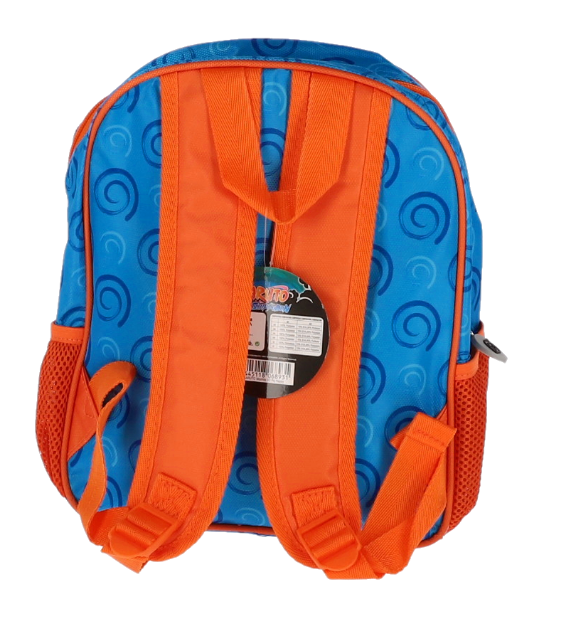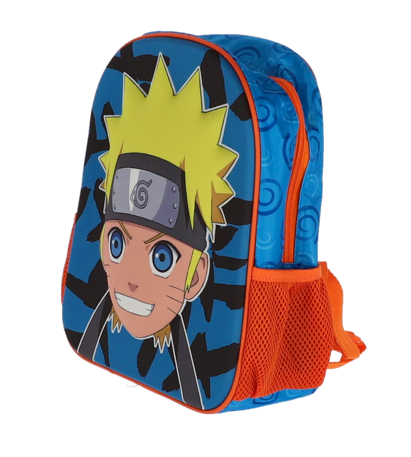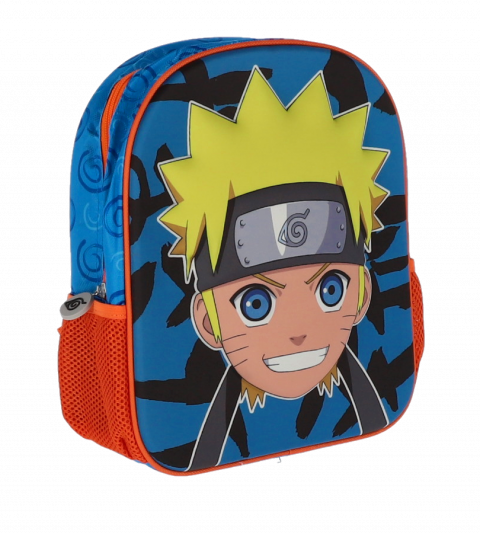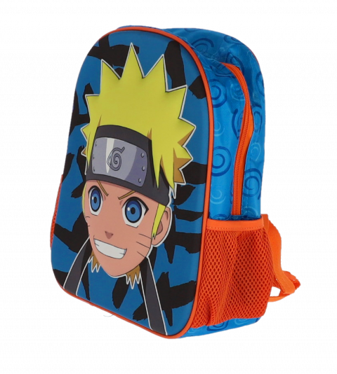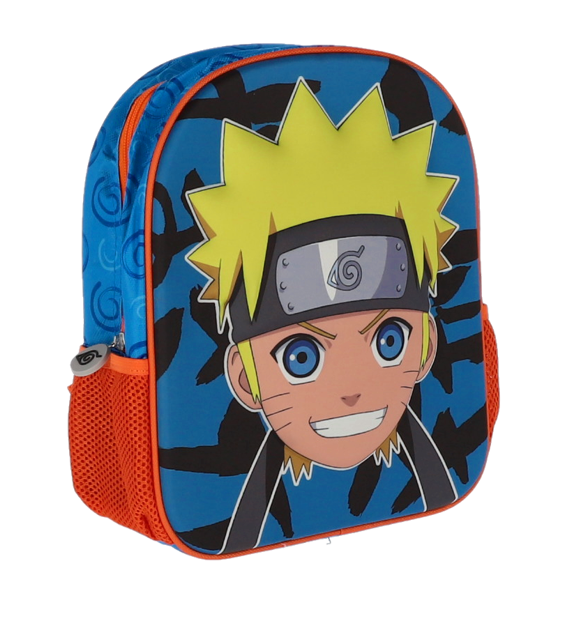 Ghiozdan preșcolari NARUTO 3D mic, perfect pentru fanii seriei anime. Design vibrant cu imprimeu tridimensional al personajului Naruto pe fond albastru și negru, buzunare laterale portocalii din plasă și bretele ajustabile. Ideal pentru grădiniță, ușor și rezistent, oferă confort și stil copiilor.