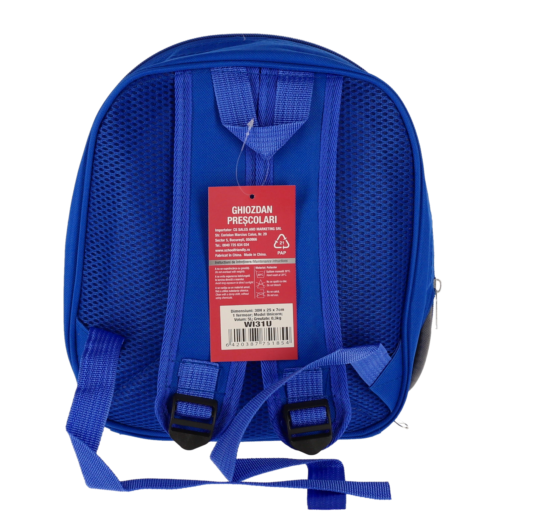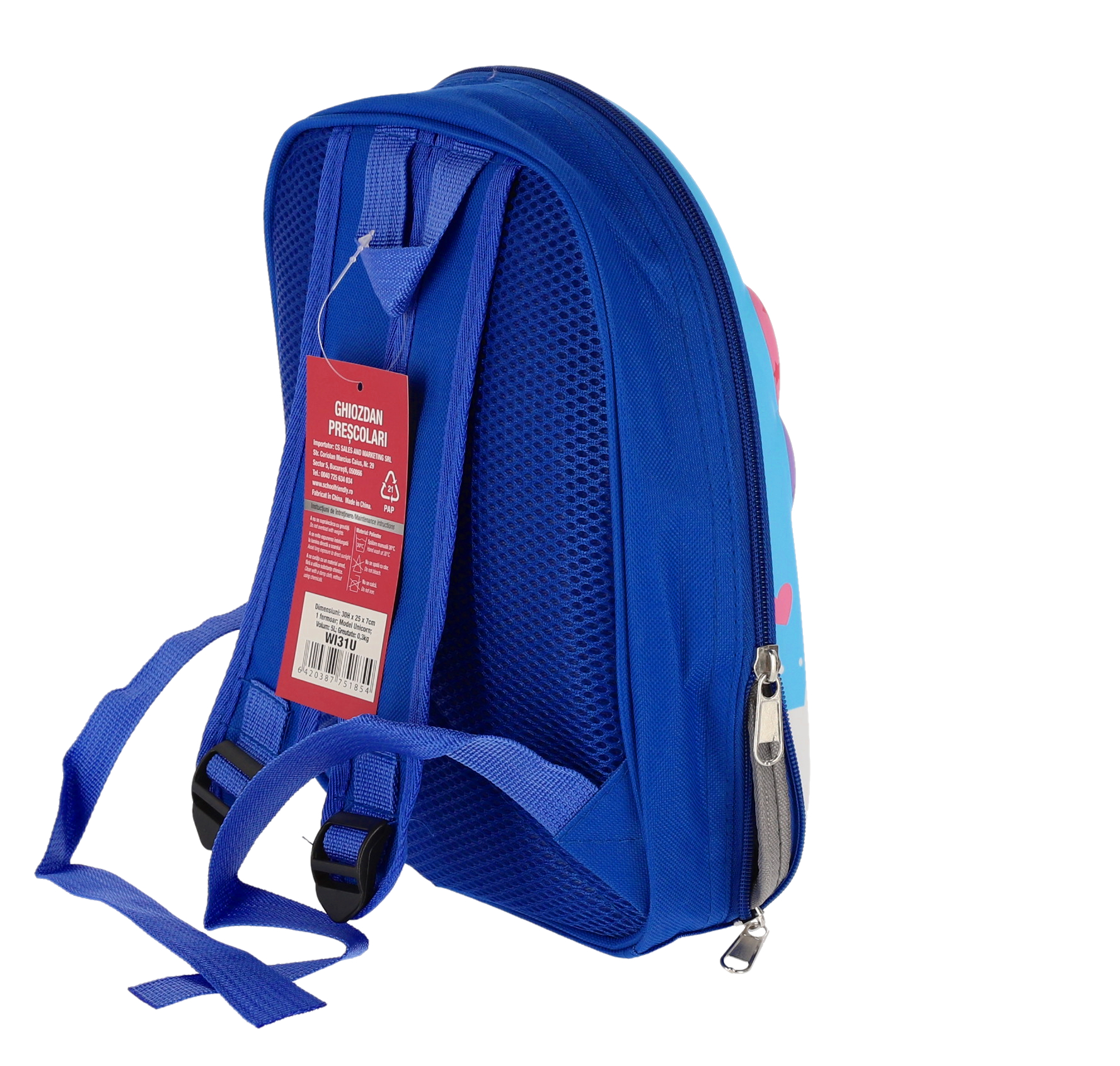 Ghiozdanul preșcolar Unicorn SF în nuanțe de albastru, echipat cu un fermoar, este partenerul ideal pentru fiecare zi plină de descoperiri la școală sau în călătorii.