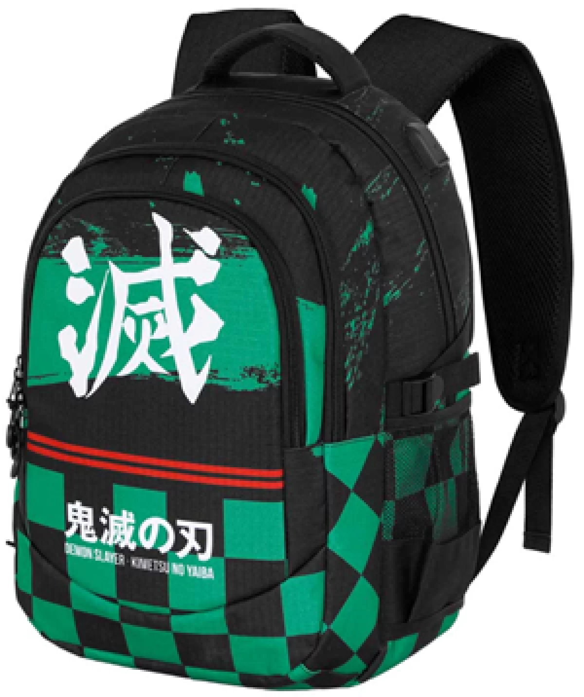Ghiozdan școlar Demon Slayer cu design multicolor negru-verde, dimensiuni 21×34×46 cm, perfect pentru fanii anime. Rucsac rezistent cu bretele ajustabile, multiple compartimente și imprimeu iconic cu model în carouri verzi și simboluri japoneze. Ideal pentru școală și activități zilnice.