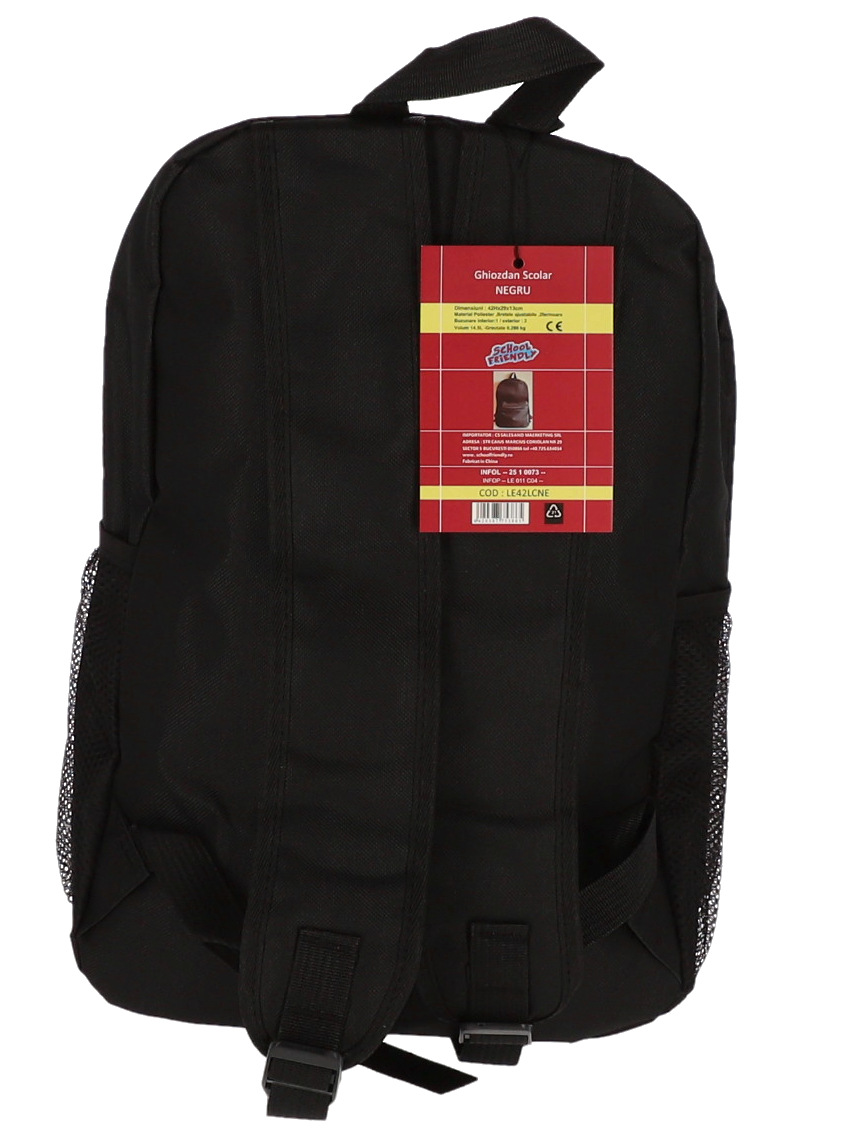 Ghiozdan școlar negru cu 2 compartimente, dimensiuni 42×29×13 cm, confecționat din material rezistent. Design modern și practic, ideal pentru elevi și studenți, oferind spațiu generos pentru cărți, caiete și accesorii. Bretele ajustabile asigură confort maxim pe tot parcursul zilei.