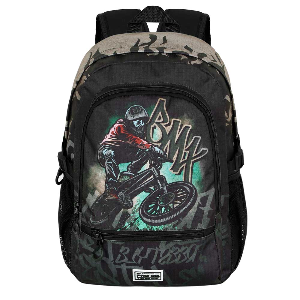 - Ghiozdan multicolor, decorat cu un imprimeu inspirat de BMX, ideal pentru băieții care adoră ciclismul și stilul urban.