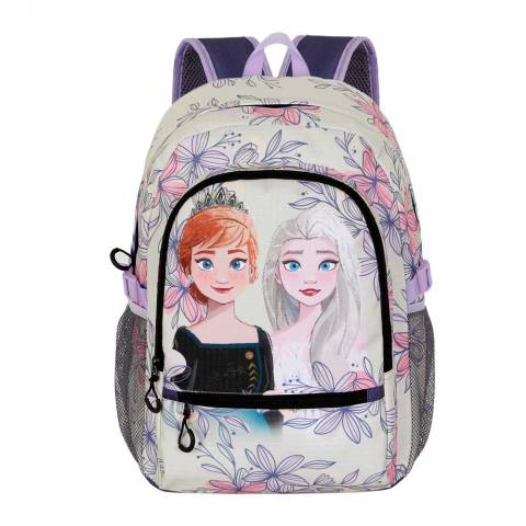 - Imprimeu cu personajele Elsa și Anna din Frozen 2 pe partea frontală, pe un fundal floral delicat.