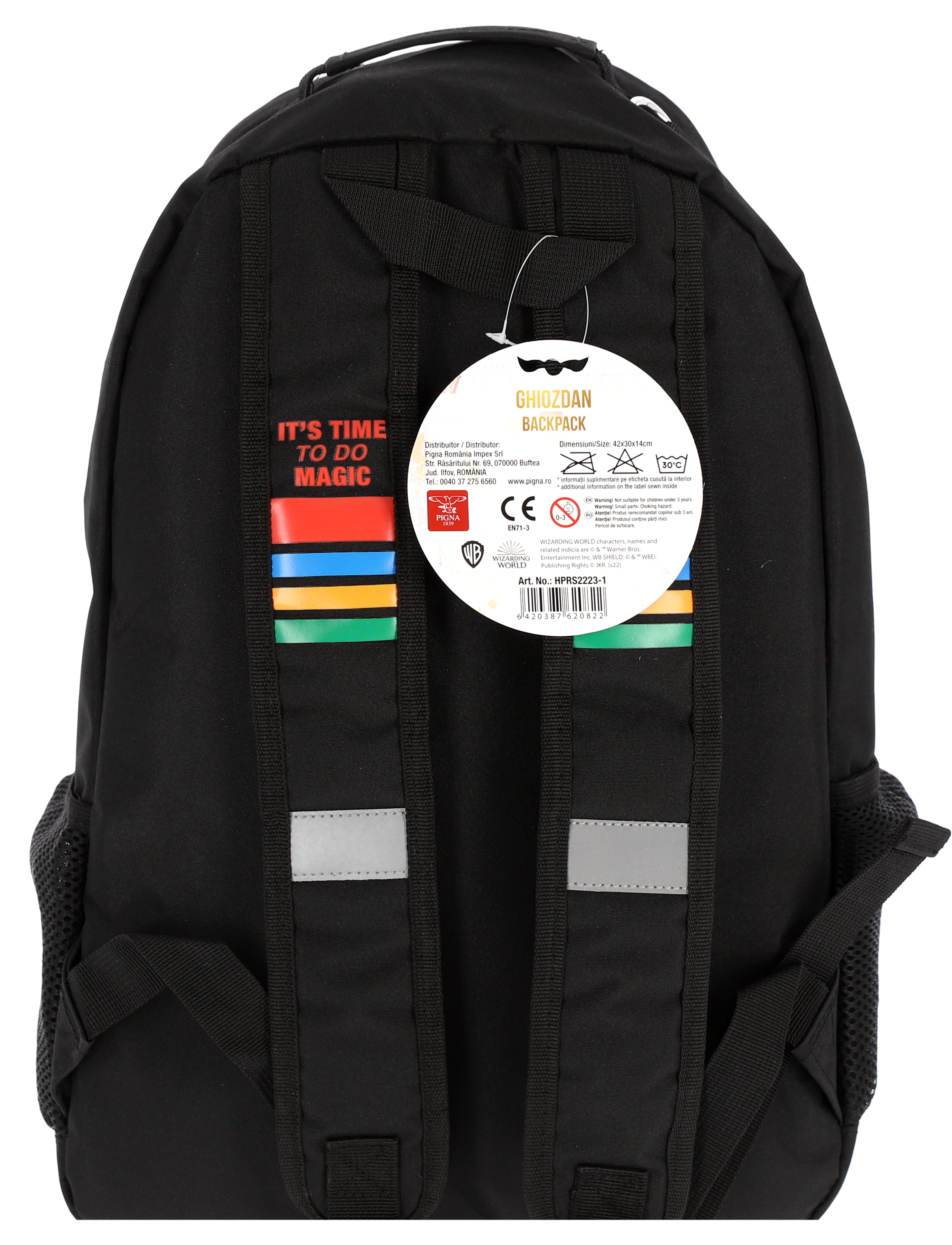 Design Harry Potter: Decorat cu simboluri și dungi caracteristice universului Harry Potter, ghiozdanul transmite atmosfera magică pe care o iubesc fanii.