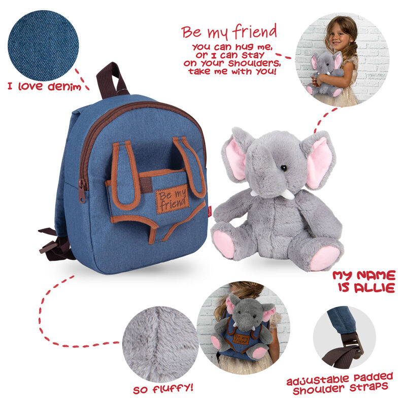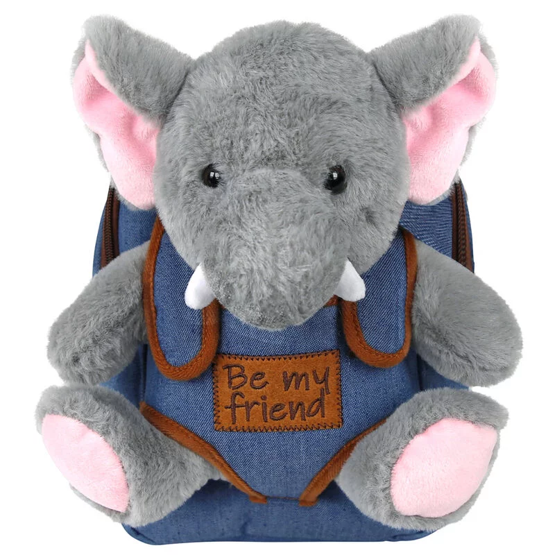 Ghiozdan școlar Schoolfriendly cu design adorabil în formă de elefant din pluș gri moale, cu detalii roz și vestă denim albastră. Rucsac de 26cm cu două compartimente cu fermoar, ideal pentru grădiniță și ciclul primar, oferind confort și rezistență pentru copii.