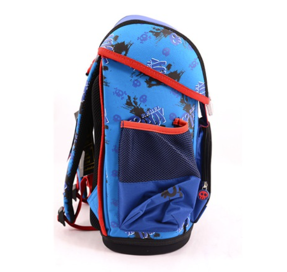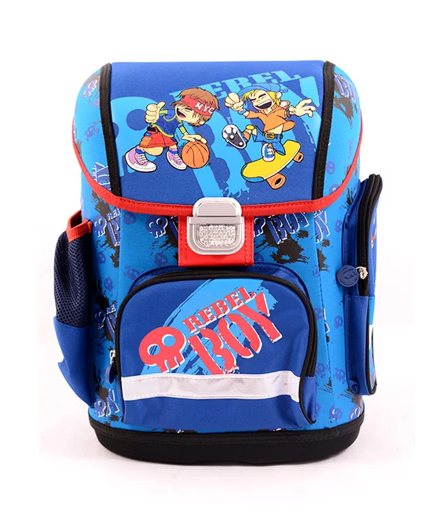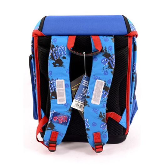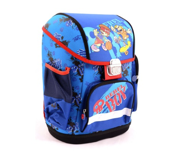 Dimensiuni: Inaltime 41cm x Latime 29.5cm x 16cm baza. Ghiozdan rigid confectionat din material impermeabil. Are 1 compartiment mare prevazut cu separator interior. Buzunarul frontal este incapator si se inchide cu fermoar. Pe laterale are 1 buzunar tip plasa si 1 buzunar inchis cu fermoar. Baza este rigida, din plastic. Spatele este ergonomic, buretat, permite circularea aerului si protejeaza spatele. Bretelele sunt ferme, buretate, protejeaza umerii.