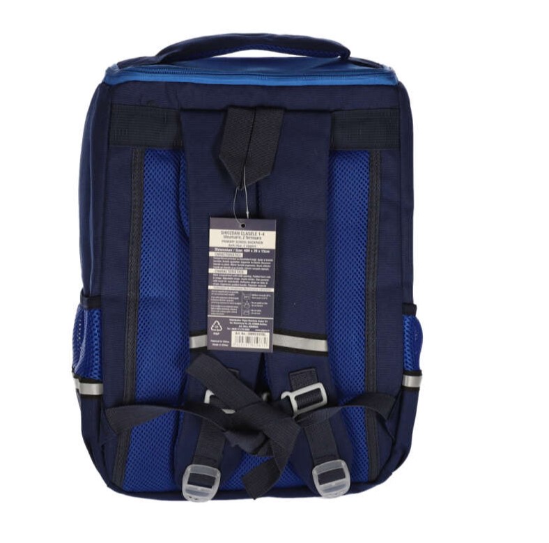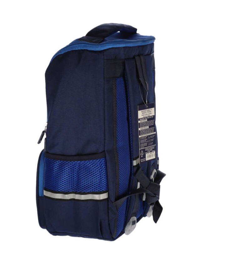 Ghiozdan 40HX29X15cm pentru clasa pregatitoare cu 2 fermoare, 3 compartimente. Bretelele sunt buretate, ajustabile si prezinta cusaturi duble in partea superioara pentru o rezistenta mai buna. Captusit la interior, spate buretat, buzunare laterale pentru sticla apa, maner buretat si agatatoare. Benzi reflectorizante pe bretele si pe buzunarele laterale. Din material poliester. Greutate: 0.47 kg. Culoare bleumarin cu albastru.