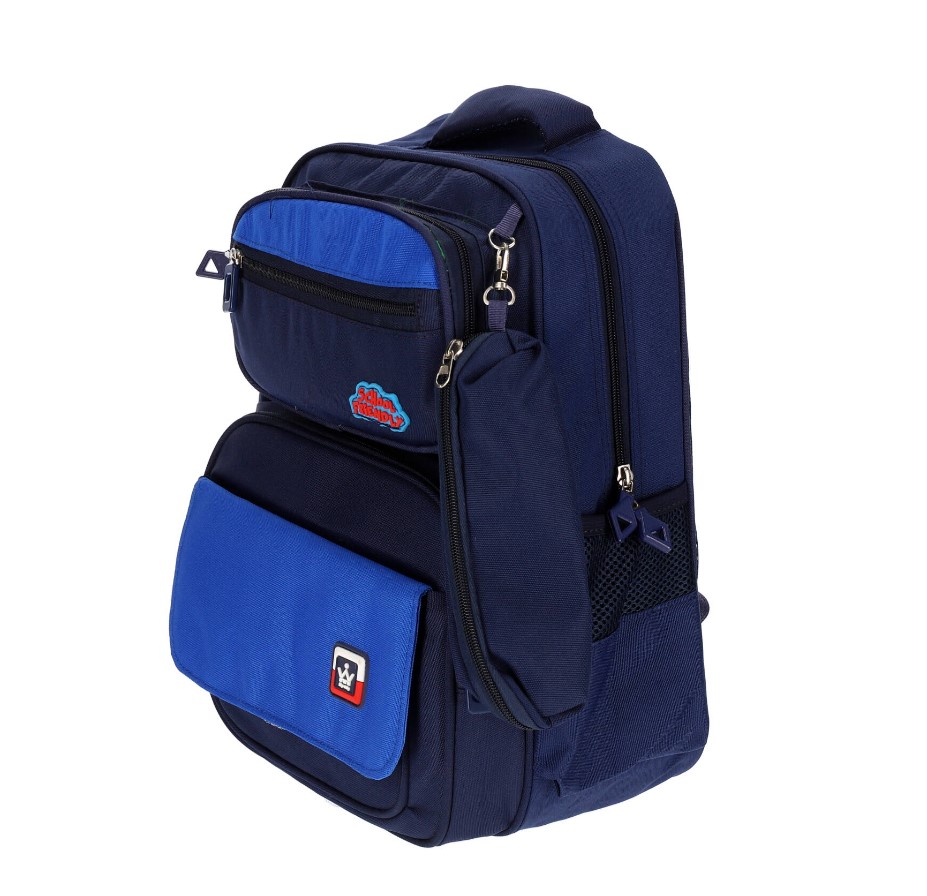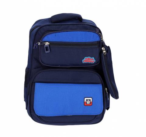 Ghiozdan 40HX30X13cm pentru clasa pregatitoare cu 4 fermoare, 5 compartimente. Bretelele sunt buretate, ajustabile si prezinta cusaturi duble in partea superioara pentru o rezistenta mai buna. Captusit la interior, spate buretat, buzunare laterale pentru sticla apa, maner buretat si agatatoare. Din material poliester. Greutate: 0.59 kg. Culoare bleumarin cu albastru deschis. Contine un penar etui tubular de culoare bleumarin.