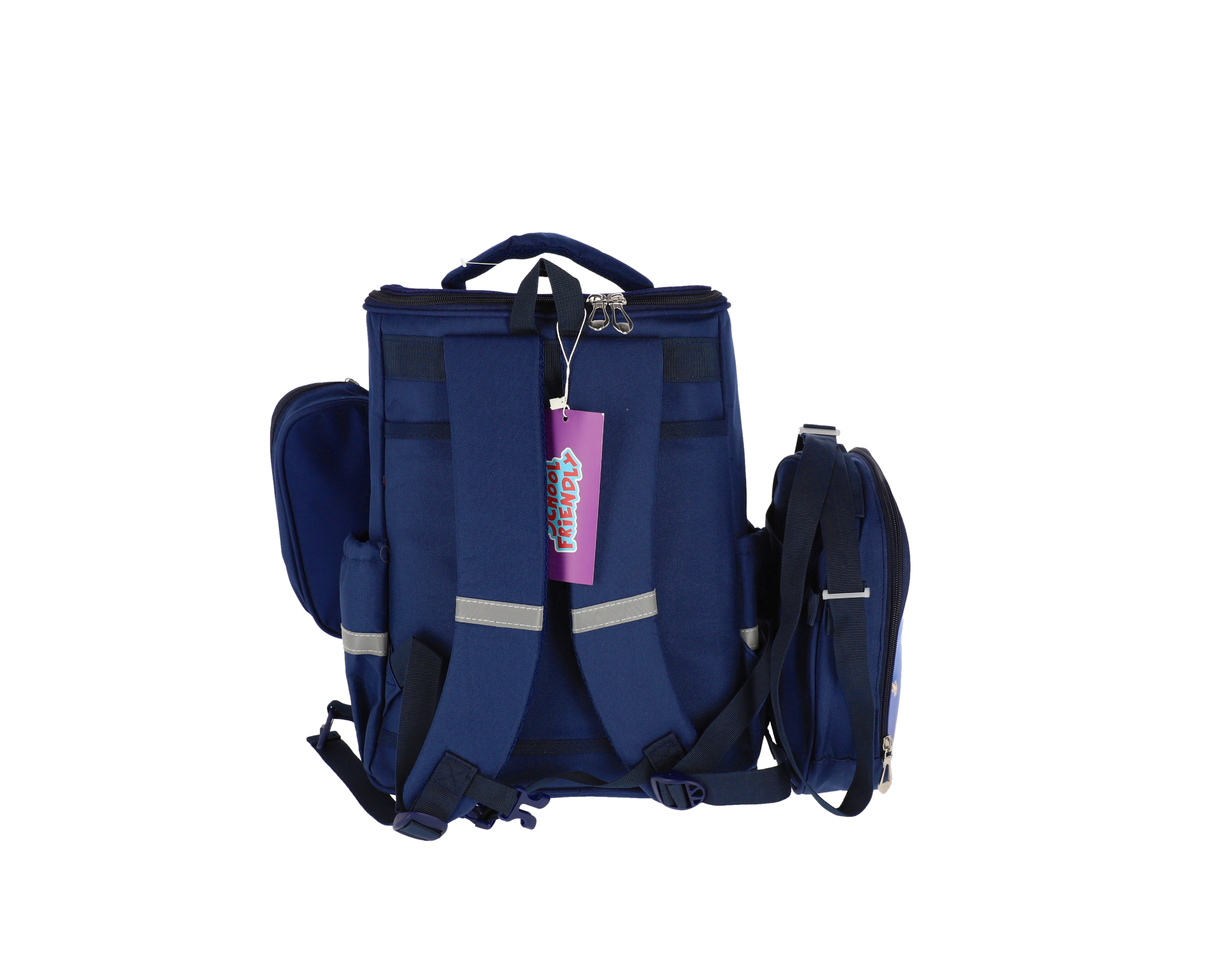 Ghiozdan școlar Schoolfriendly cu design astronaut albastru, dimensiuni 36x30x20 cm, echipat cu două fermoare și bretele ergonomice. Setul include penar cilindric și geantă pentru prânz asortate, toate cu imprimeu spațial colorat. Ideal pentru copii, oferă spațiu generos și compartimente multiple pentru organizare optimă.