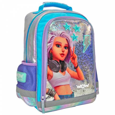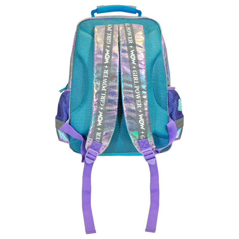 Ghiozdan școlar Wow Generation de 40 cm cu design holografic iridescent în nuanțe de albastru, violet și argintiu. Dispune de două compartimente cu fermoare, buzunare laterale din plasă, mâner superior ergonomic și bretele ajustabile, ideal pentru copii și adolescenți care caută un accesoriu modern și funcțional.