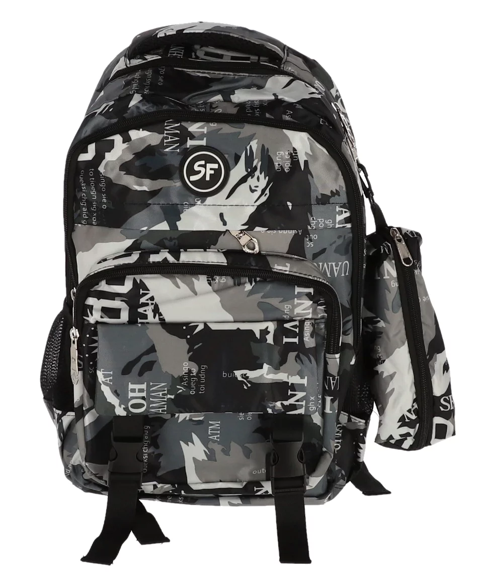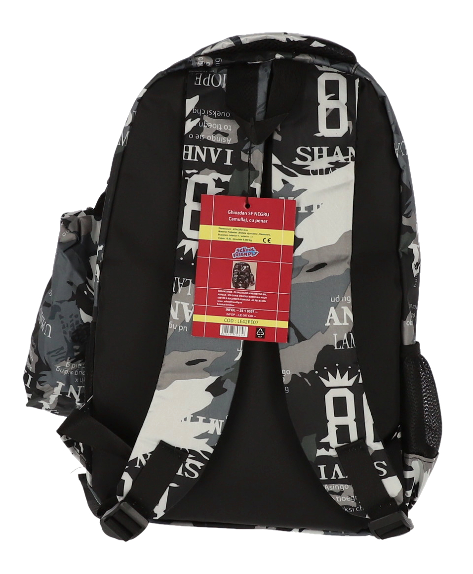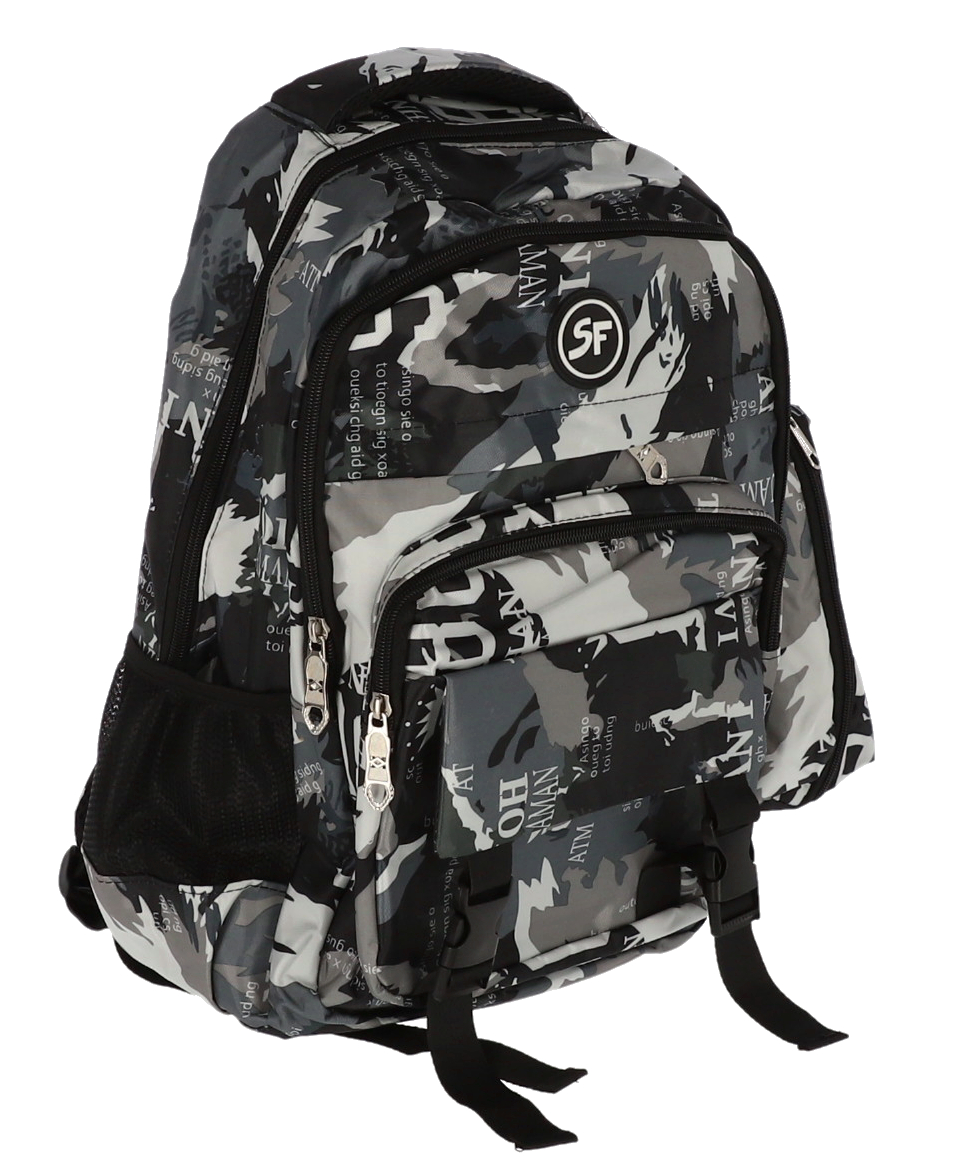 Ghiozdan școlar SF cu design camuflaj negru-gri, dimensiune 42 cm, echipat cu 4 compartimente cu fermoar pentru organizare optimă și penar inclus. Rucsac rezistent cu bretele ajustabile, buzunare laterale și spate ergonomic, ideal pentru elevi și adolescenți.