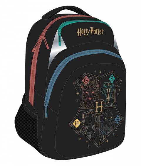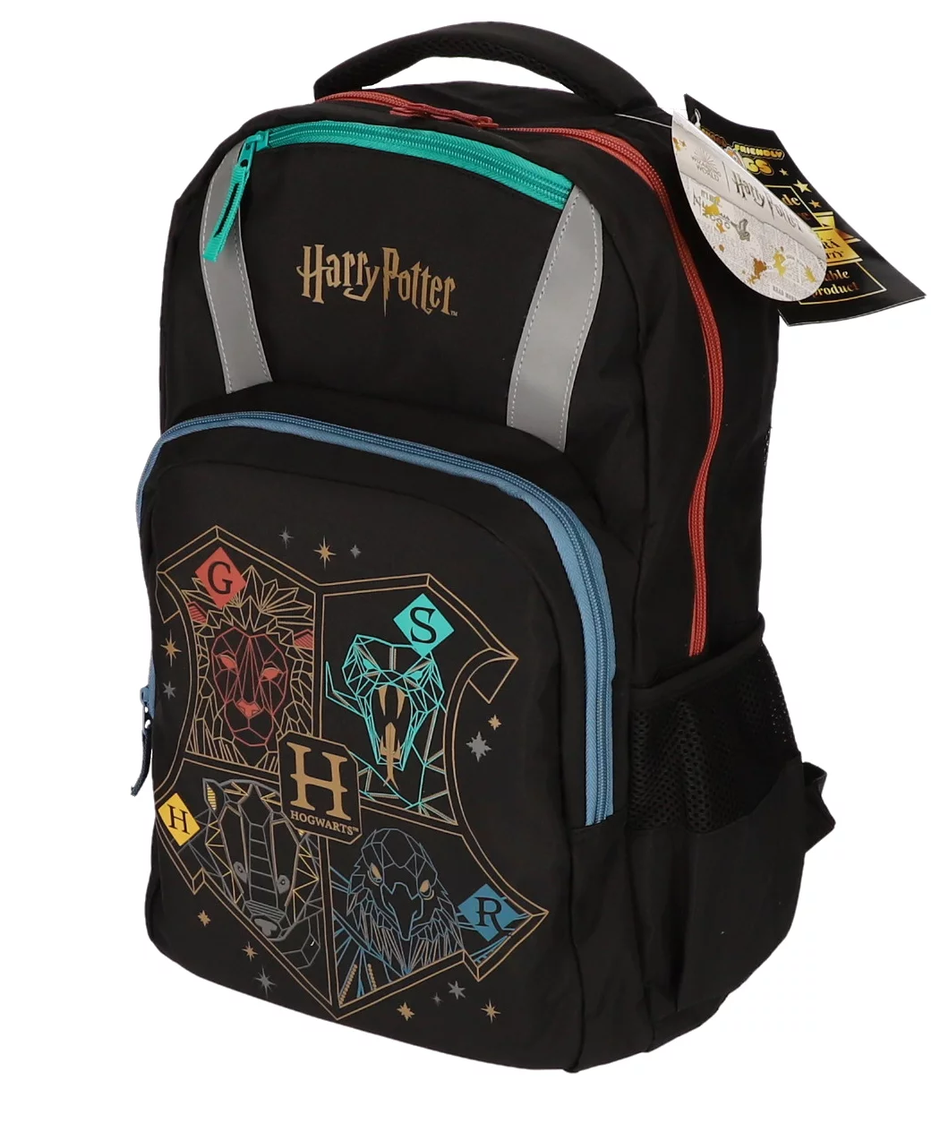 Ghiozdan Harry Potter pentru adolescenți, negru cu design emblematic al celor patru case Hogwarts, fermoare colorate și bretele matlasate. Spațios cu trei compartimente separate cu fermoar, dimensiuni 45×32×14 cm, ideal pentru școală sau activități zilnice. Material rezistent, buzunare laterale.