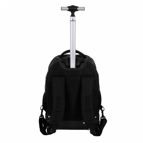 Ghiozdan troler Mickey Mouse negru cu design modern, dotât cu roți rezistente și mâner telescopic retractabil pentru transport ușor. Fabricat din materiale durabile, prezintă imprimeu iconic Mickey Mouse pe fundal negru cu detalii roșii, buzunare multiple și bretele ajustabile. Dimensiuni generoase de 47×32×25 cm, ideal pentru școală și călătorii.